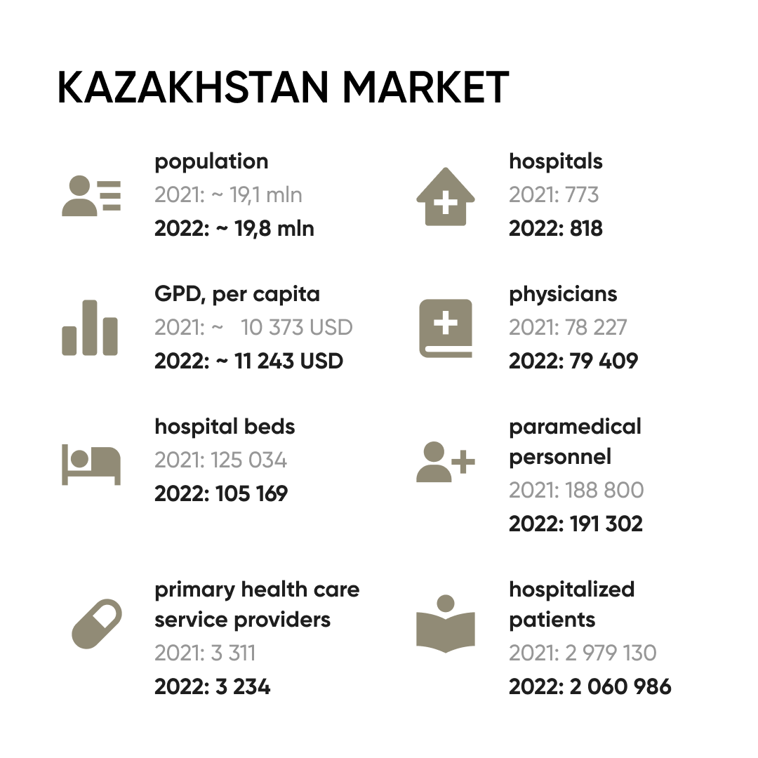 Расходы на здравоохранение в Казахстане составляют 3,7% от ВВП, что ниже среднего уровня в странах с таким же уровнем экономического и социального развития. Тем не менее, за последние несколько лет бюджеты на здравоохранение были увеличены, и правительство ставит перед собой задачу достичь уровня расходов в размере 5% от ВВП к 2025 году.